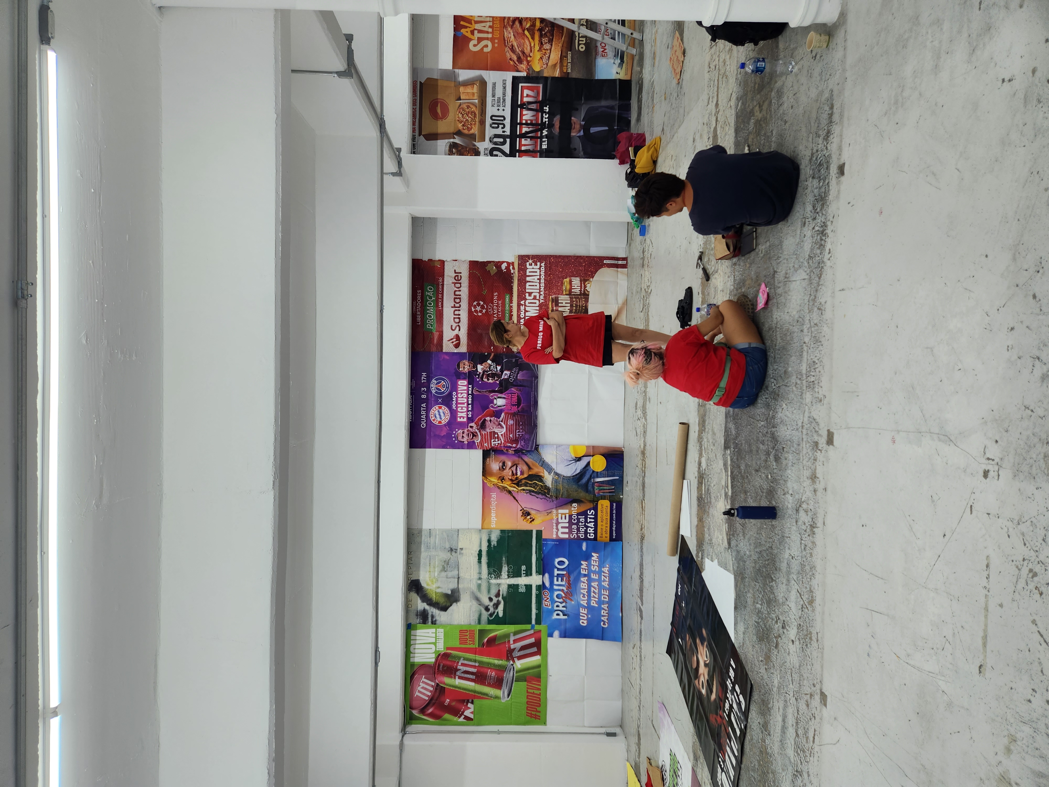 preta pintada de branco, de uma pintura mural coletiva sobre cartazes de pontos de